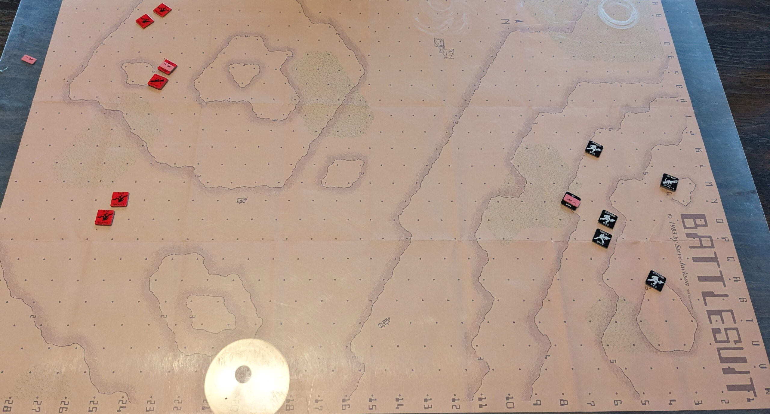 Mark came over on the 27th for all-too-rare FtF gaming during our off week. Up this time was SJG’s old Battlesuit pocket box game, which both of us got in the reprint version a couple years ago. I had it in the Space Gamer magazine version (still have the magazine, but the counters are long gone), and soloed it some in the ’80s, and thought it seemed good.