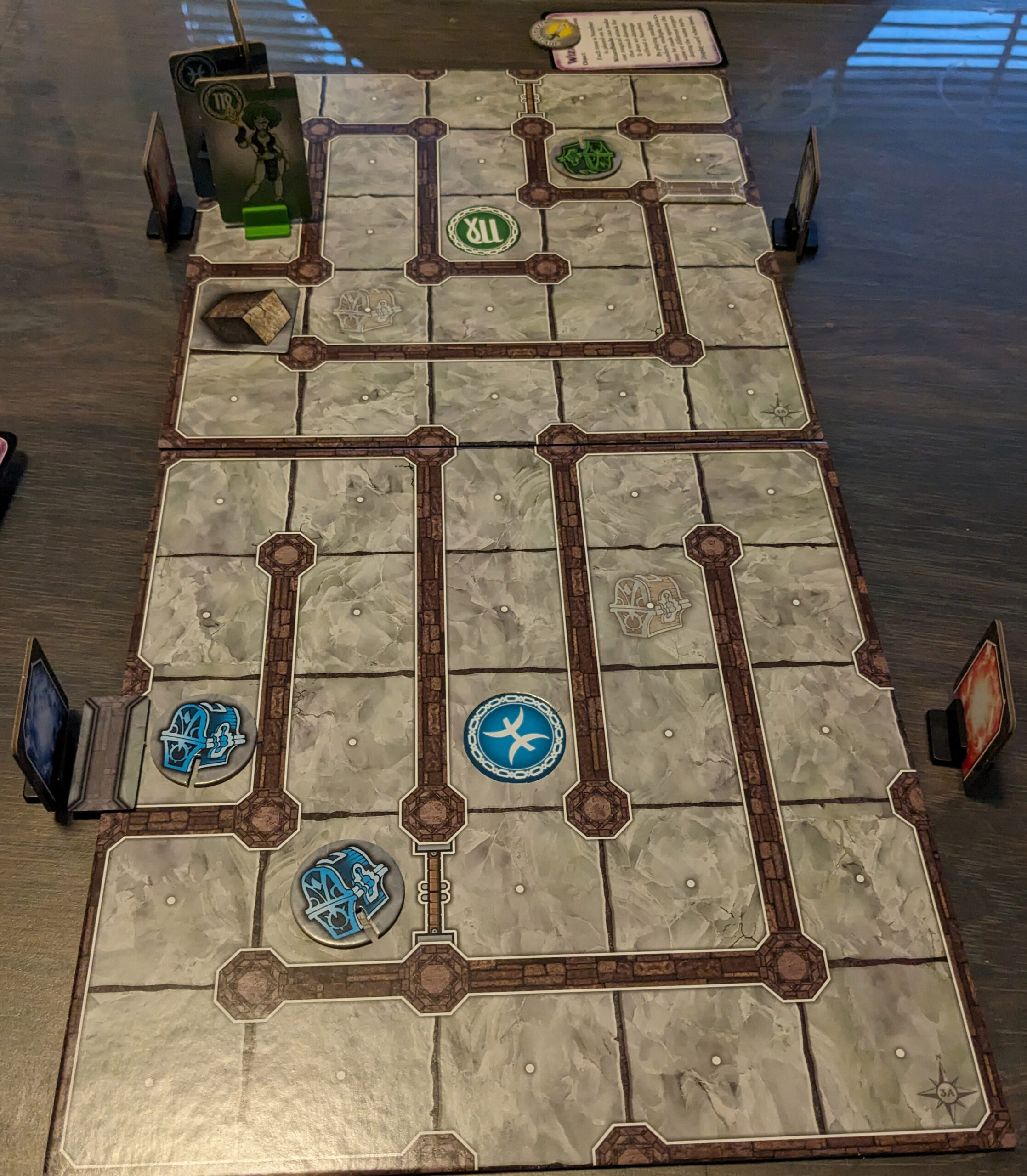 After that, we had some extra time, and pulled out Wiz-War for a two-player game. I had an opening hand that was a little too good, so I went the first few turns not playing any cards, and seeking out Mark. He tried to siphon cards out my hand, and I countered that, and then did a 10-damage spell, which I reflected… and he countered with heal to get his life up to the max of 20. A 7-point fireball put him back in trouble, especially when I used a shadowstone and throwing knife to give myself 3 of his hit points. But Mark drew a wizard blade, and repeated number cards quickly lowered my health. We both stayed in the same area for a while, as we kept stopping to pick up dropped items, and I eventually finished him off (I forget what with) for a win while carrying one of his treasures.