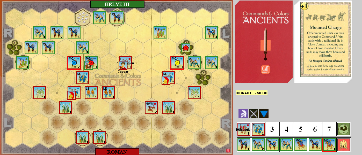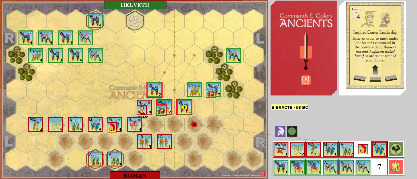 After Getting Out of Hatten, Patch and I did our usual between games round of Commands & Colors: Ancients. Up this time was the Battle of Bibracte, the earliest scenario in Julius Caesar’s career. The Helvetii have a force of Auxilia and Warriors, while the Romans have a mix of Auxilia and Mediums, with two Heavies, and one HWM. The Romans are largely on hills, and both sides have two camp hexes that can be looted for a banner, though the Roman ones have Auxilia permanently stationed in them.
