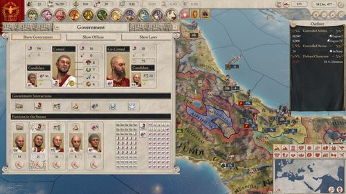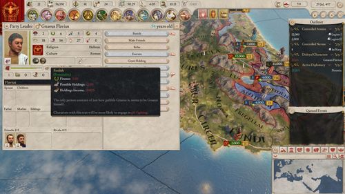 The important element here is instead of everything revolving around the relationship of a character to the ruler as seen in Crusader Kings, it instead looks his loyalty to the state. Rulers may come and go, but they generally don’t cause immediate changes in loyalty. A popular ruler will generate loyalty, and republics have factions with loyalty depending on that. Disloyal characters will block efforts to hold them in check, and may band together in a civil war.