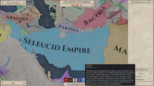 Like all of Paradox Development Studio’s games, it is a pausable real-time empire management game. You can control any available country (big or small), and manage its military, diplomatic, and economic development, in a grand strategy game format. It starts 24 years before the previous game, in 304 BCE, and runs to the same end of 27 BCE. The scope is vastly increased, with the map reaching east through India (generally based on the final version of CK II’s map). Both the new map, and new decades help put an early focus on the diadochoi, or successor states to Alexander the Great, which are still major powers fighting each other as the game starts.