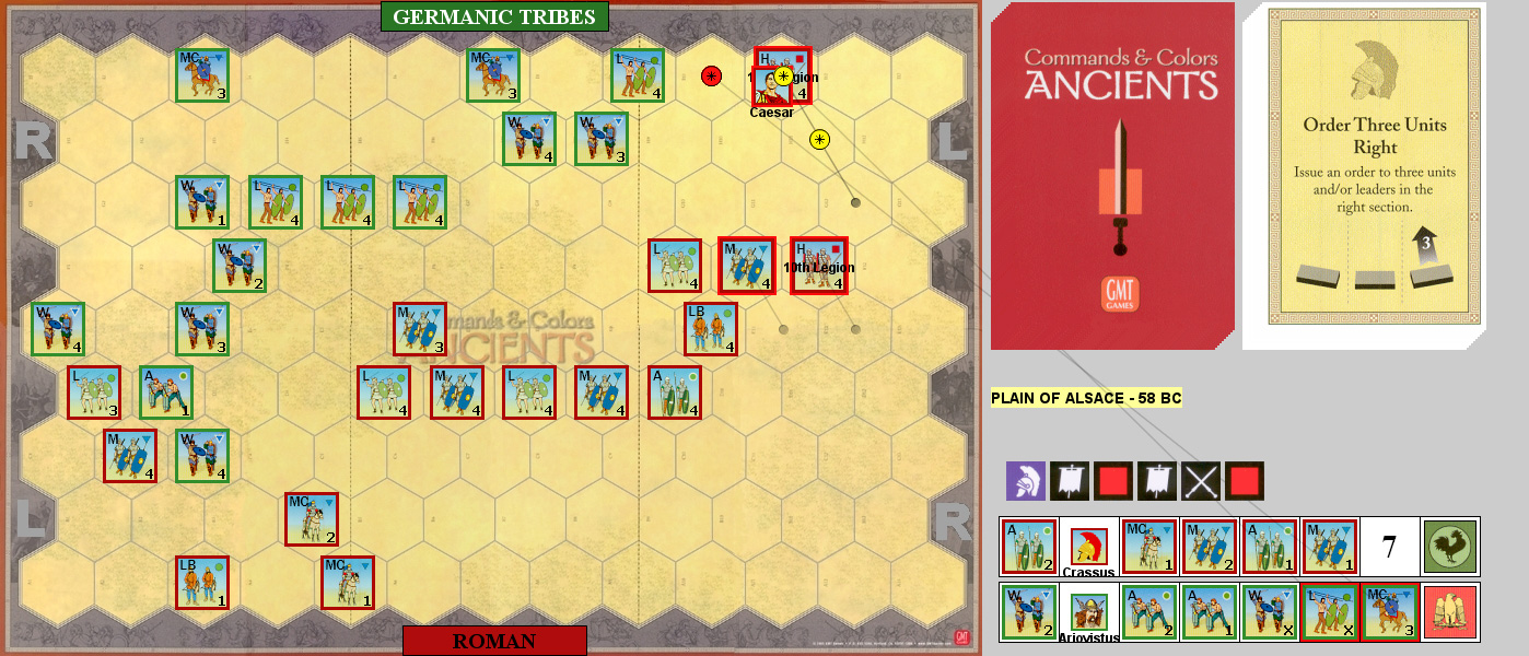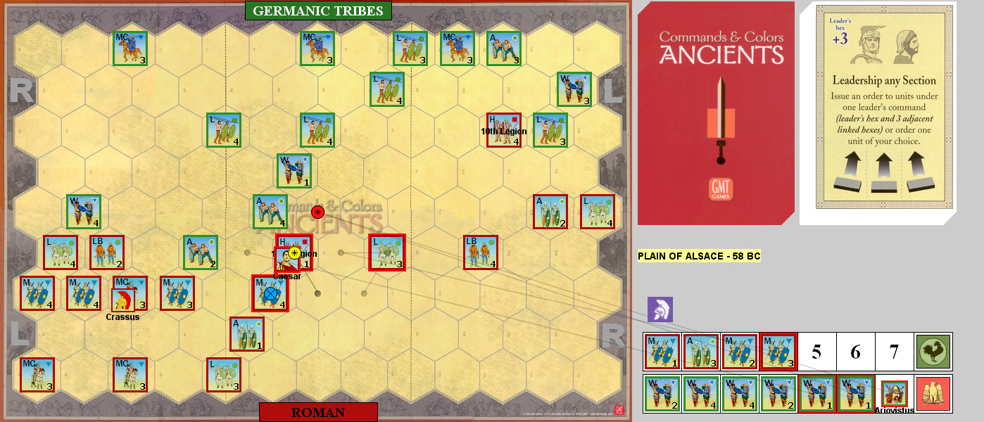 After going on patrol, Patch and I went to our normal round of Commands & Colors: Ancients. This time was “Plain of Alsace” from Expansion 3. Germanics versus Caesar, with both sides about equal, but the Romans have Julian regions, Caesar, a second leader (the Germans just have Ariovistus), and two more cards.