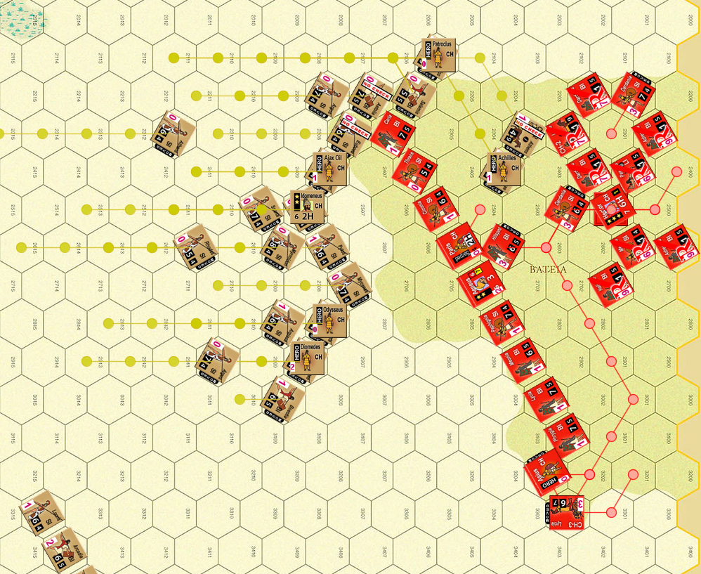 The real problem is now the Danaan camp was full. By the scenario rules, the Trojans rout to the city (with infinite stacking), their allies rout to the banner as normal, and the Danaans rout to their own camp, with normal stacking. After the first six routed units everyone else automatically flee until units can be rallied and moved out. I had moved Agamemnon back so he could rally them, but I still needed a wing commander in range to activate the rallied units and move them out.