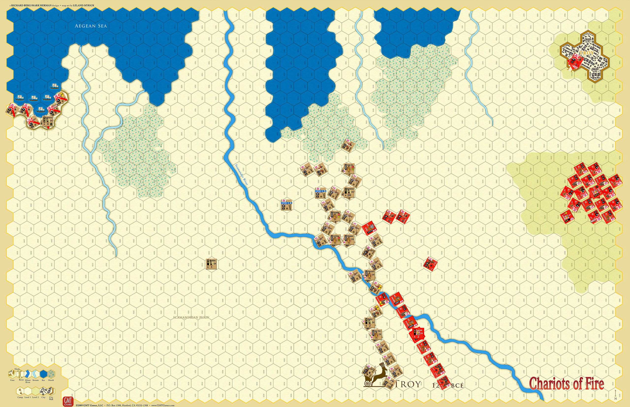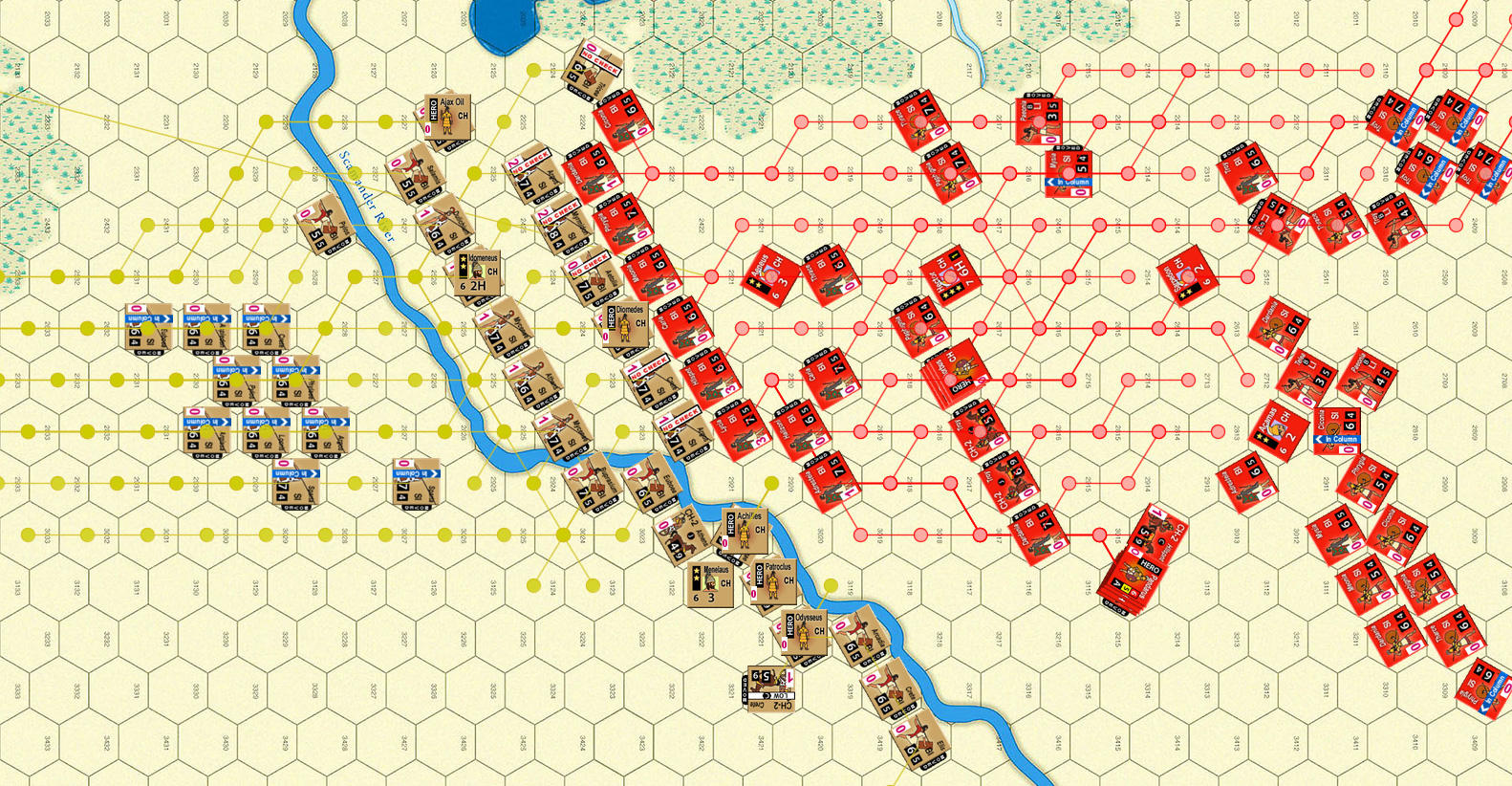 Getting my north flank over the Scarmander when I did proved to be important, and was something I actively worked on. Though the river is less of a problem than it seems, since it’s a mere -1 in combat. Being able to get the BI in there and quickly follow up with SI really worked out, and because I kept the engagement on a fairly narrow front, I kept having wave after wave of reinforcements to feed in that just scattered the Trojan line.