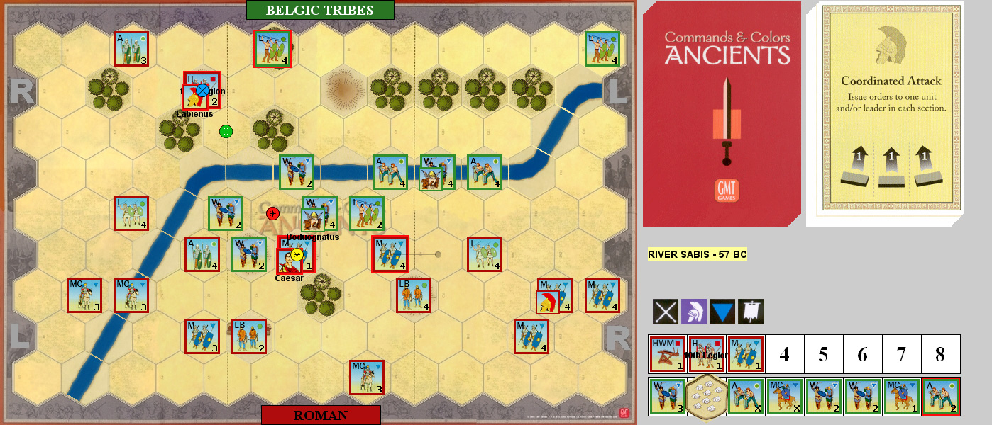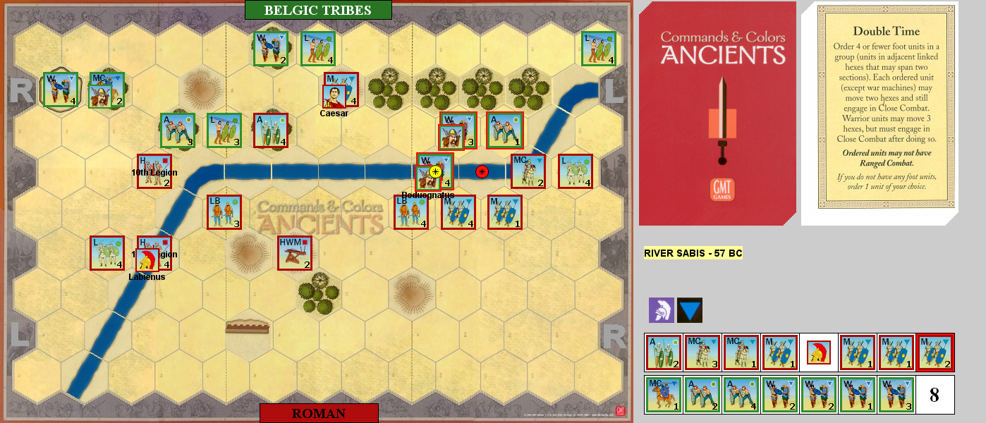 I had the Belgics first and started with Order Lights to do a hit to a LB. Patch Ordered Four Left to get the 10th Legion into the river and force a MC to retreat and lose a block. Line Command got my forces into the river, and forced three units to retreat but did no blocks while taking two on an Auxiliary. Patch used Leadership on his left to do a hit to a Warrior. I had Leadership in the center to get across the river and force the HWM to retreat and do a block to a Medium while losing two on a Warrior. Double Time took Patch into my right flank, wiped out a Warrior, did a hit to an Auxiliary, and took my camp.