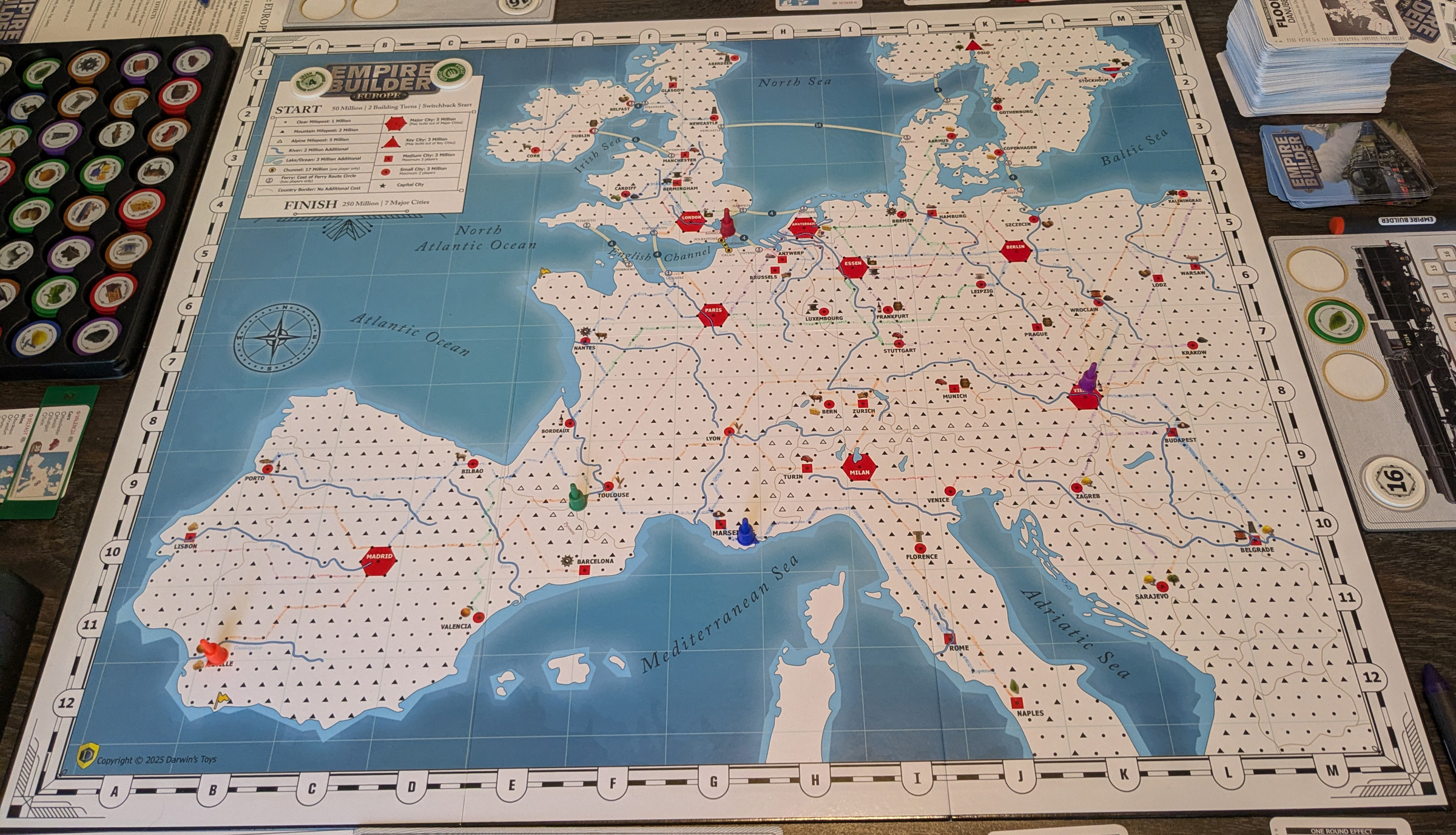 Mostly it feels like the old Eurorails set. The new “key cities” are a good touch. The Chunnel looks interesting, but the cost kept us all away (I nearly used it to get to London, but thankfully stuck to a normal ferry, since I just didn’t have need to go there).