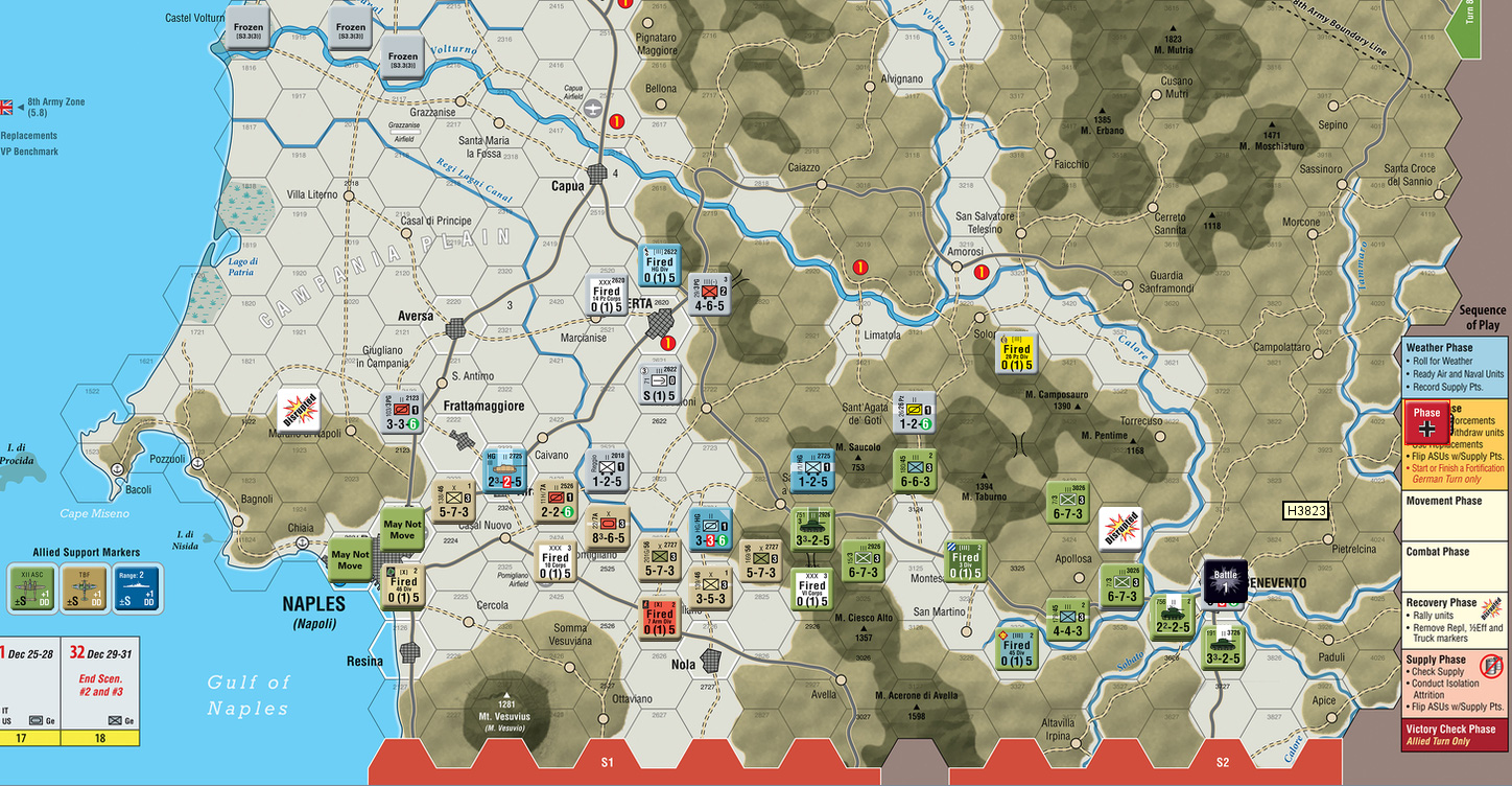 After trying out Chitin I, Mark and I decided to get back to the ZOC-bond system and do the short scenario for Italy ’43, “Crossing the Volturno”. This is a seven turn scenario (compared to the 32-turn full game), and effectively only uses about the bottom third of the map. It also leaves out the fortification building important in the main game.