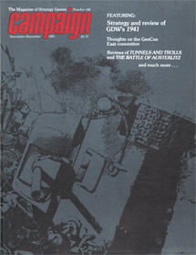 The November-December 1981 issue of Campaign magazine (#106) featured review and strategy for 1941, reports on GenCon East, and reviews of The Battle of Austerlitz and Tunnels & Trolls.